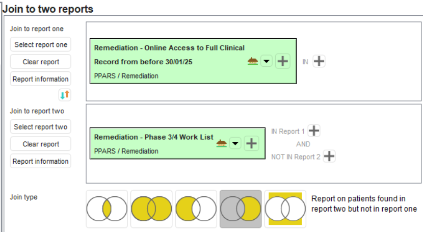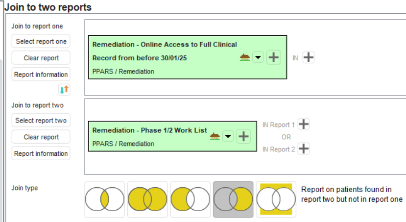 - Join the report to 'Remediation - Online Access to Full Clinical Record from before 30/01/25' & 'Remediation - Phase 1/2 Worklist' with a join type of 'Report on patients found in report two but not in report one'