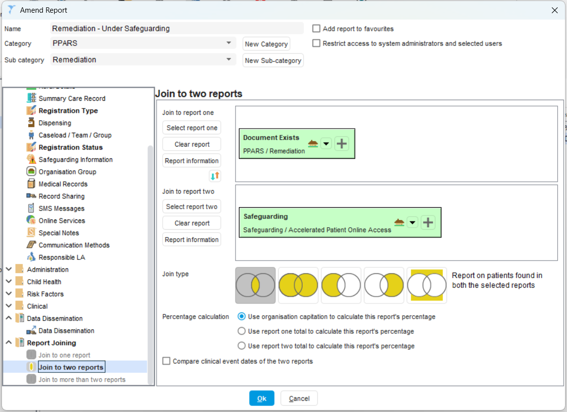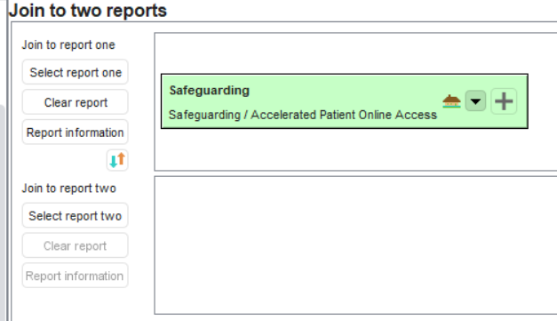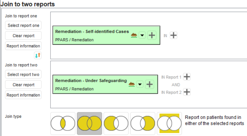 - Join the report to 'Remediation - Self-identified Cases' & 'Remediation - Under Safeguarding' with a join type of 'Report on patients found in either of the selected reports'