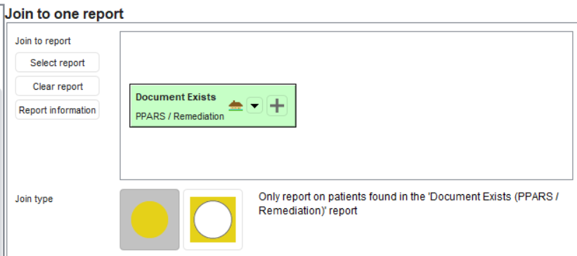 - Join to 'Document Exists' with the join type of 'Only report on patients found in the 'Document Exists (PPARS/Remediation)' report