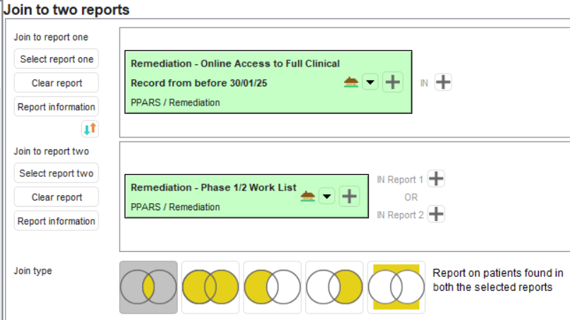 - Join the report to 'Remediation - Online Access to Full Clinical Record from before 30/01/25' & 'Remediation - Phase 1/2 Worklist' with a join type of 'Report on patients found in both the selected reports'