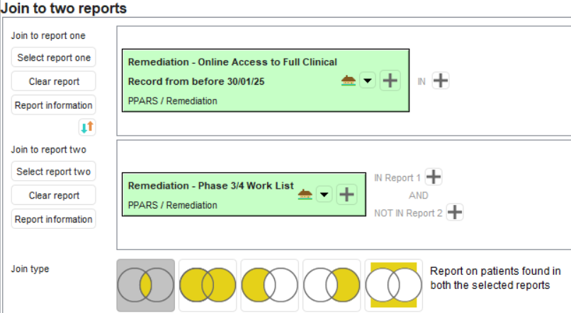 - Join the report to 'Remediation - Online Access to Full Clinical Record from before 30/01/25' & 'Remediation - Phase 3/4 Worklist' with a join type of 'Report on patients found in both the selected reports'
