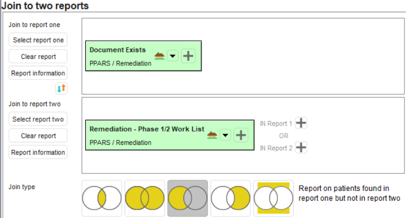 - Join the report to 'Document Exists' & 'Remediation - Phase 1/2 Worklist' with a join type of 'Report on patients found in report one but not in report two'