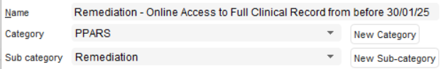 Rename the report 'Remediation - Online Access to Full Clinical Record from before 30/01/25' and select the same category and sub category as previously Within Registration: